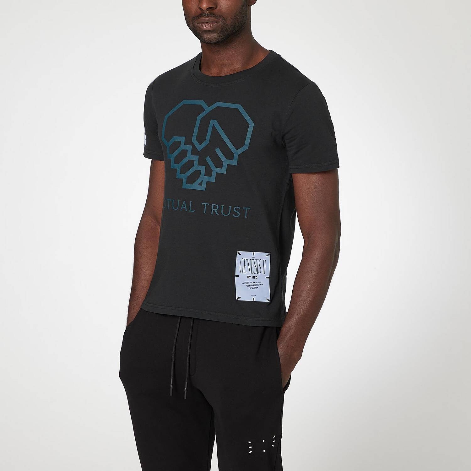 A heart-heavy handshake graphic tops a message of 'Mutual Trust' across the design of this MCQ t-shirt; creating a casual staple with a welcome theme.